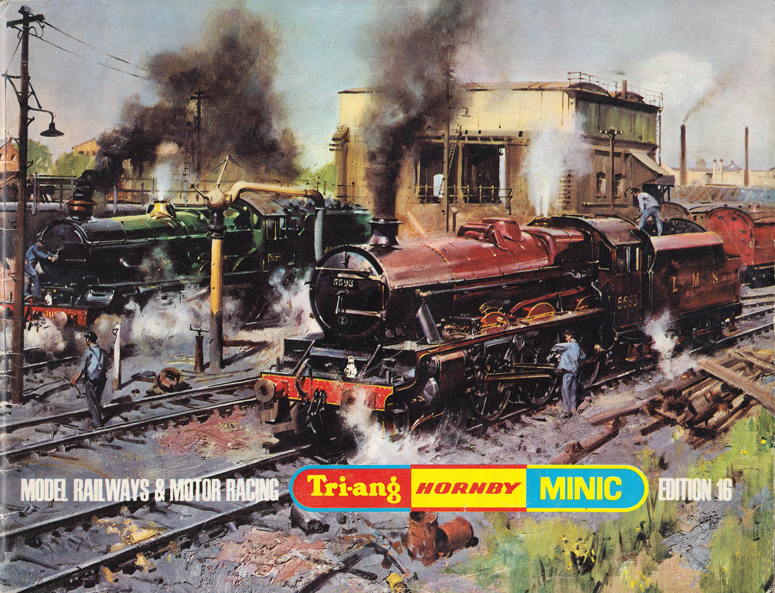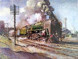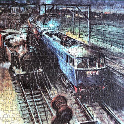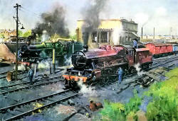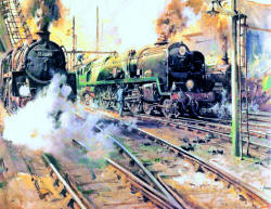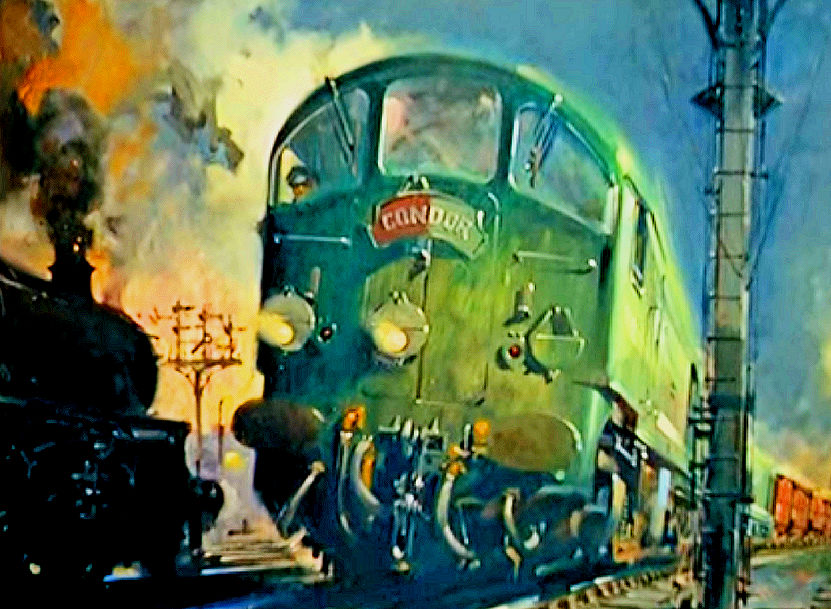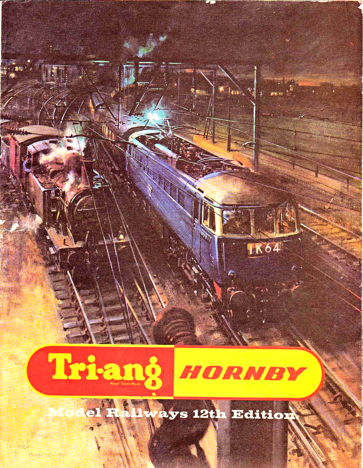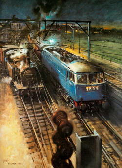 carry the Tri-ang HORNBY branding. The painting was titled 'Night Scene at Crewe' but Cuneo later renamed it 'Voltage versus Steam' Rovex Commission |