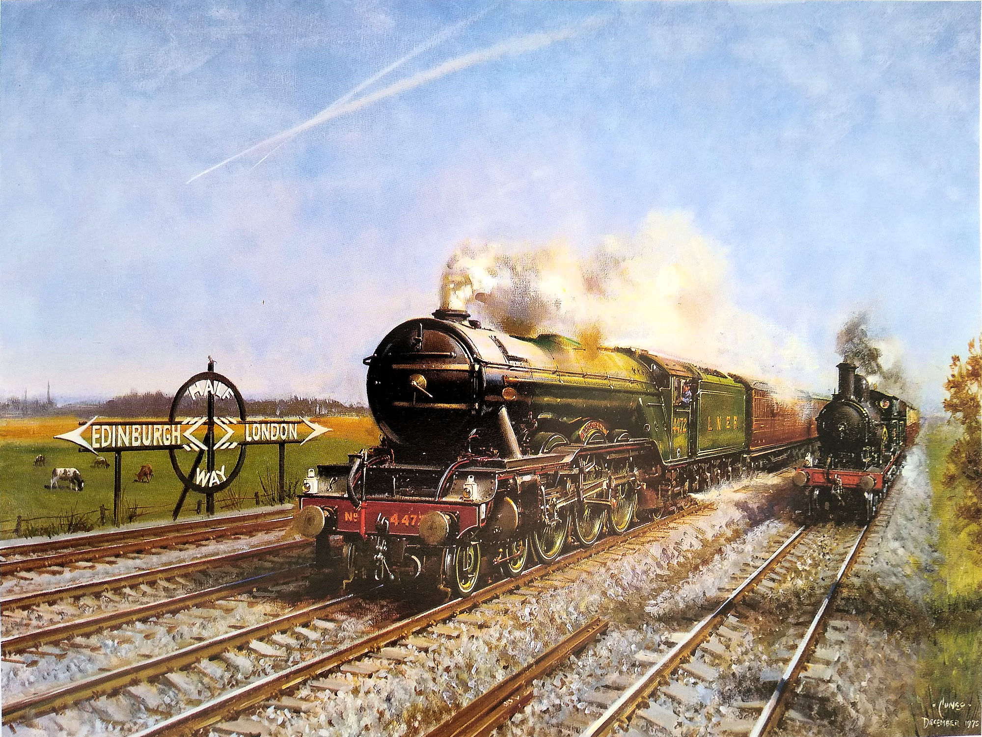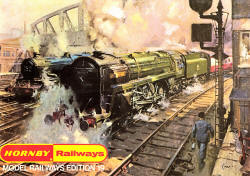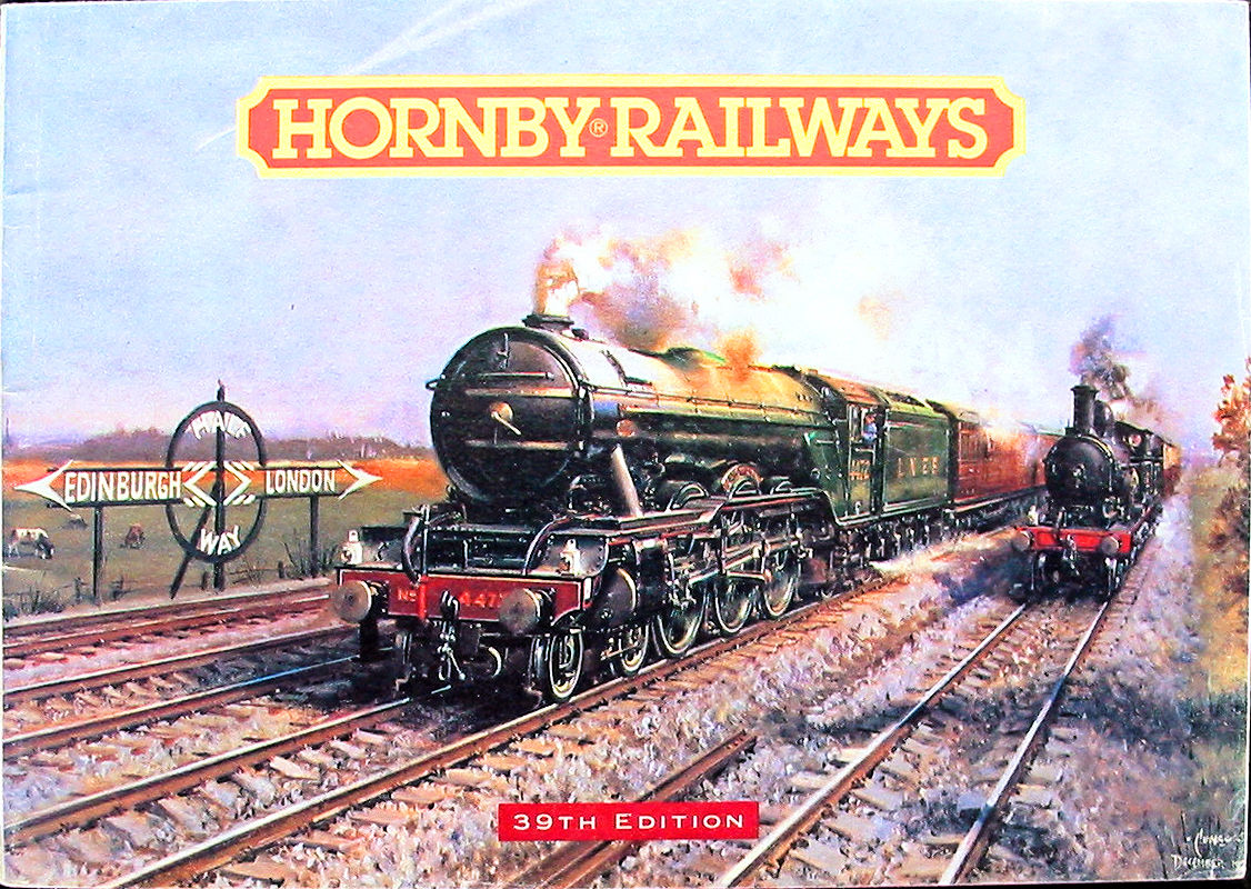 39th HORNBY Railways Catalogue used this 1975 Cuneo image 'The Flying Scotsman - Halfway Between Edinburgh and London' |