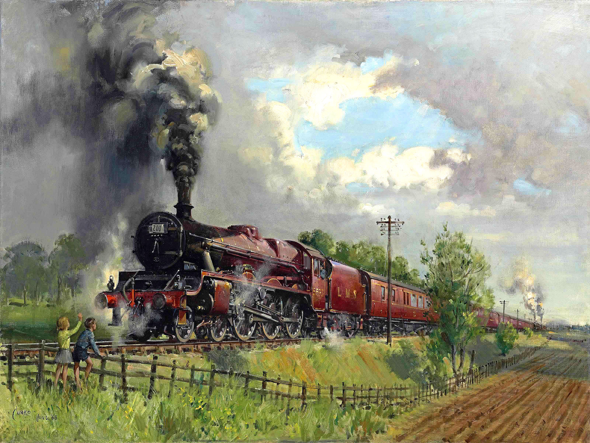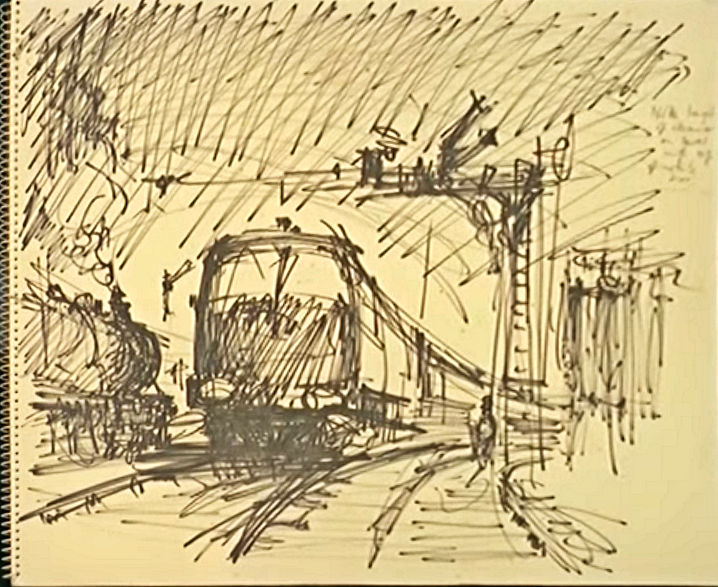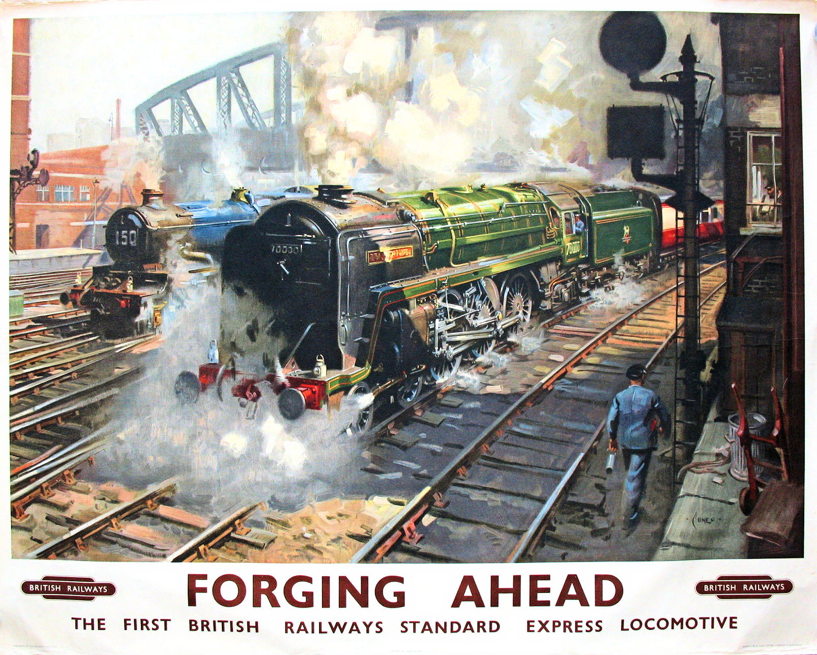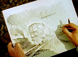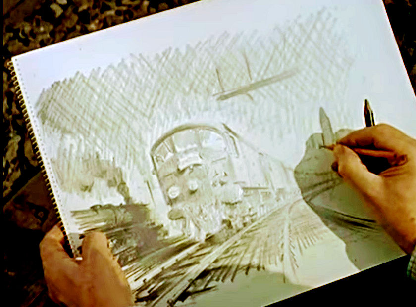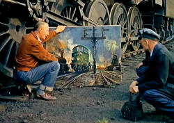 | Cuneo was comissioned by the British Railways Midland Region to paint an image for a poster aimed at publicising the recently introduced Night Freight Service. The actual process of the painting was followed by a BRITISH PATHE News crew who later released it as a short film. It can be seen HERE screen grabs of the film are shown below. | |||