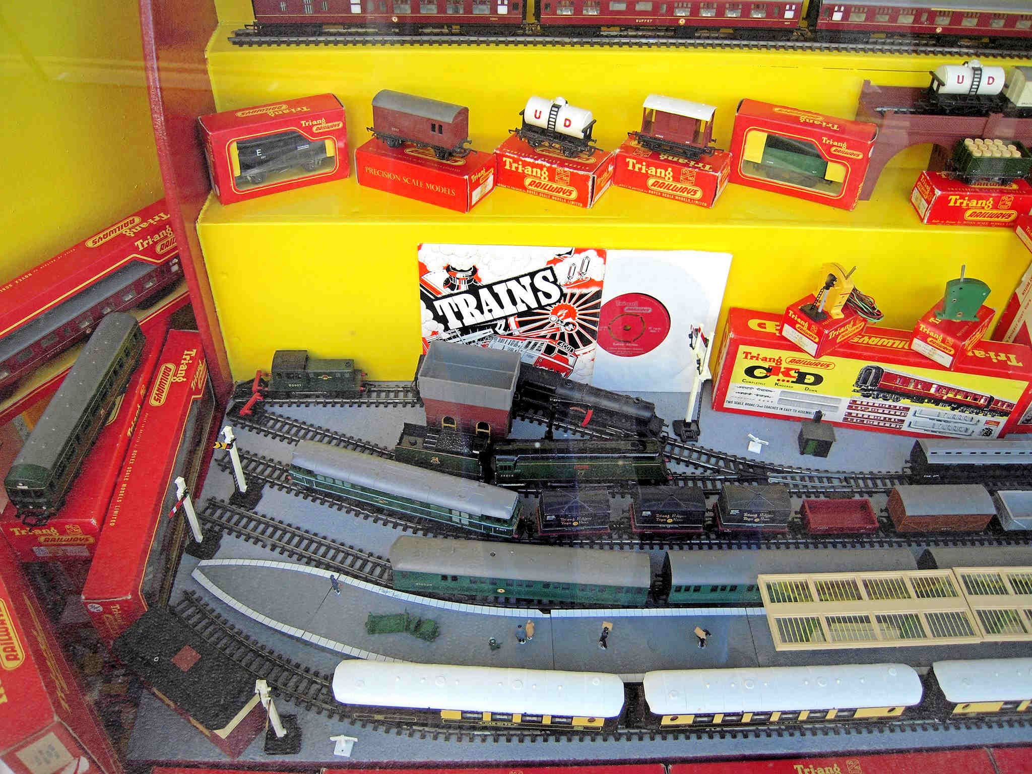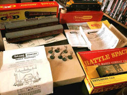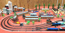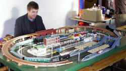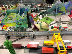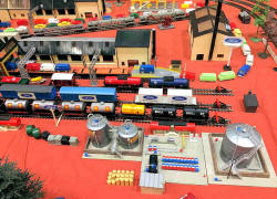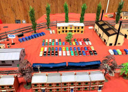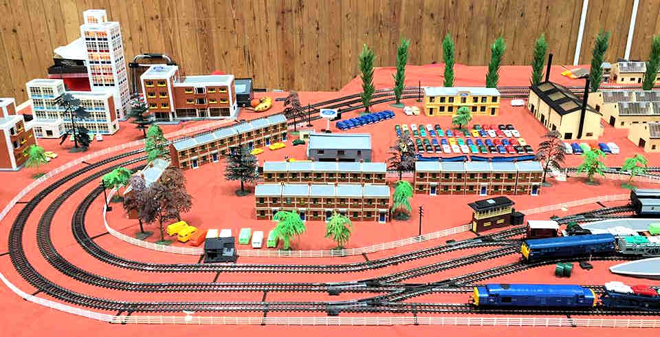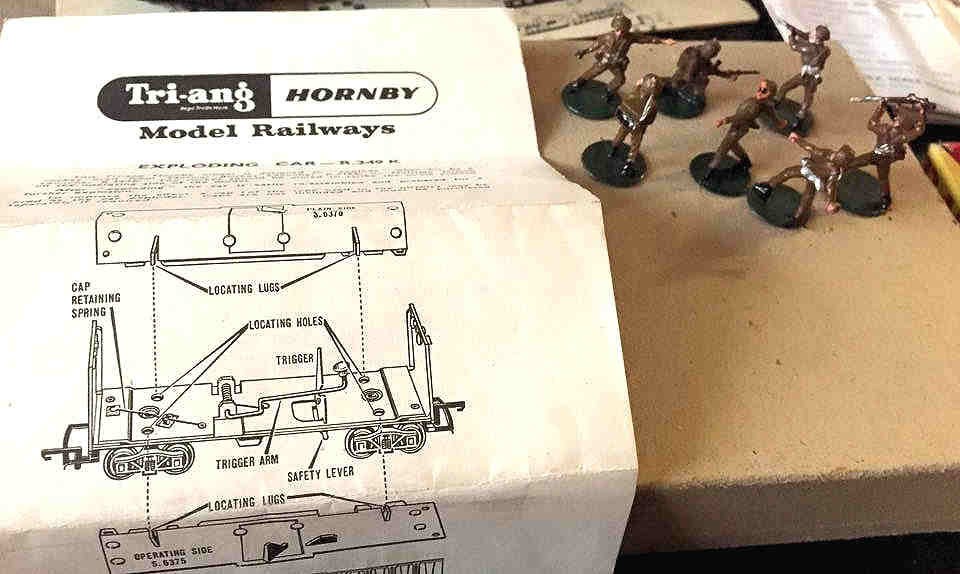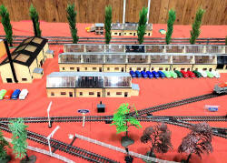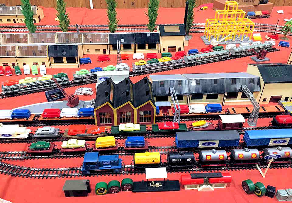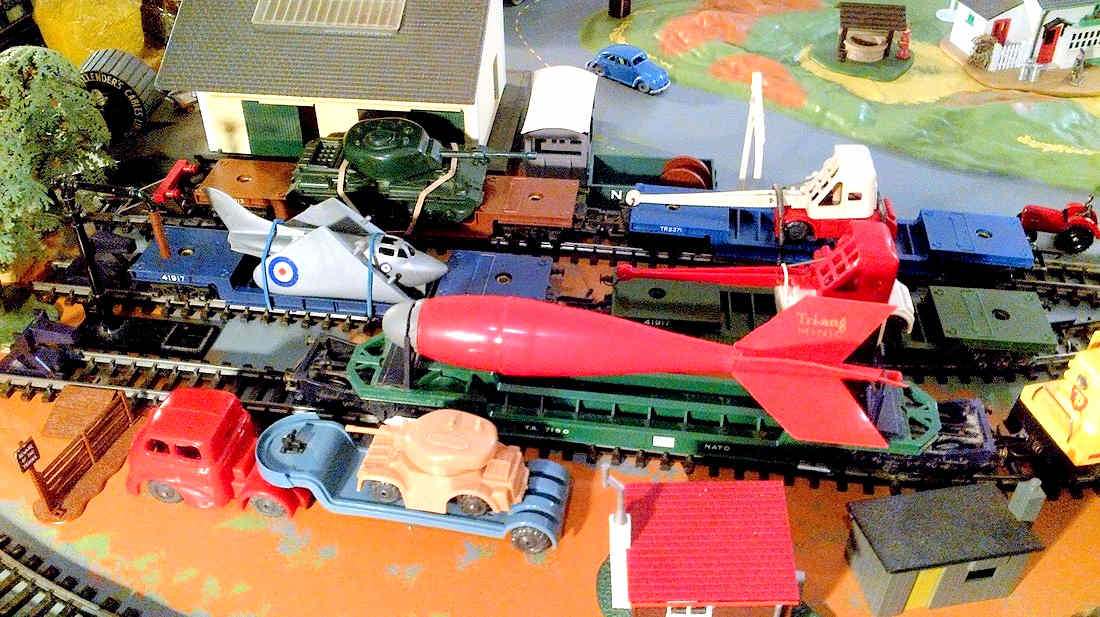 Rolande Allan's goods yard on his Hornby R.997 Pre-formed Layout featuring a variety of Tri-ang Minic 'Push and Go' Models with a military theme