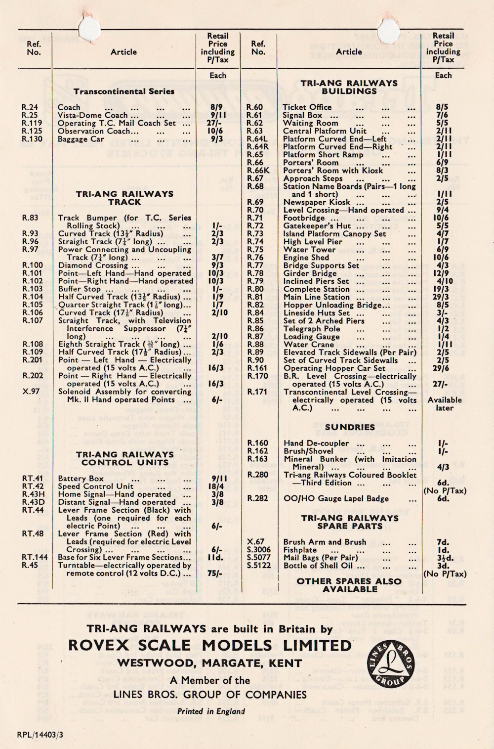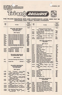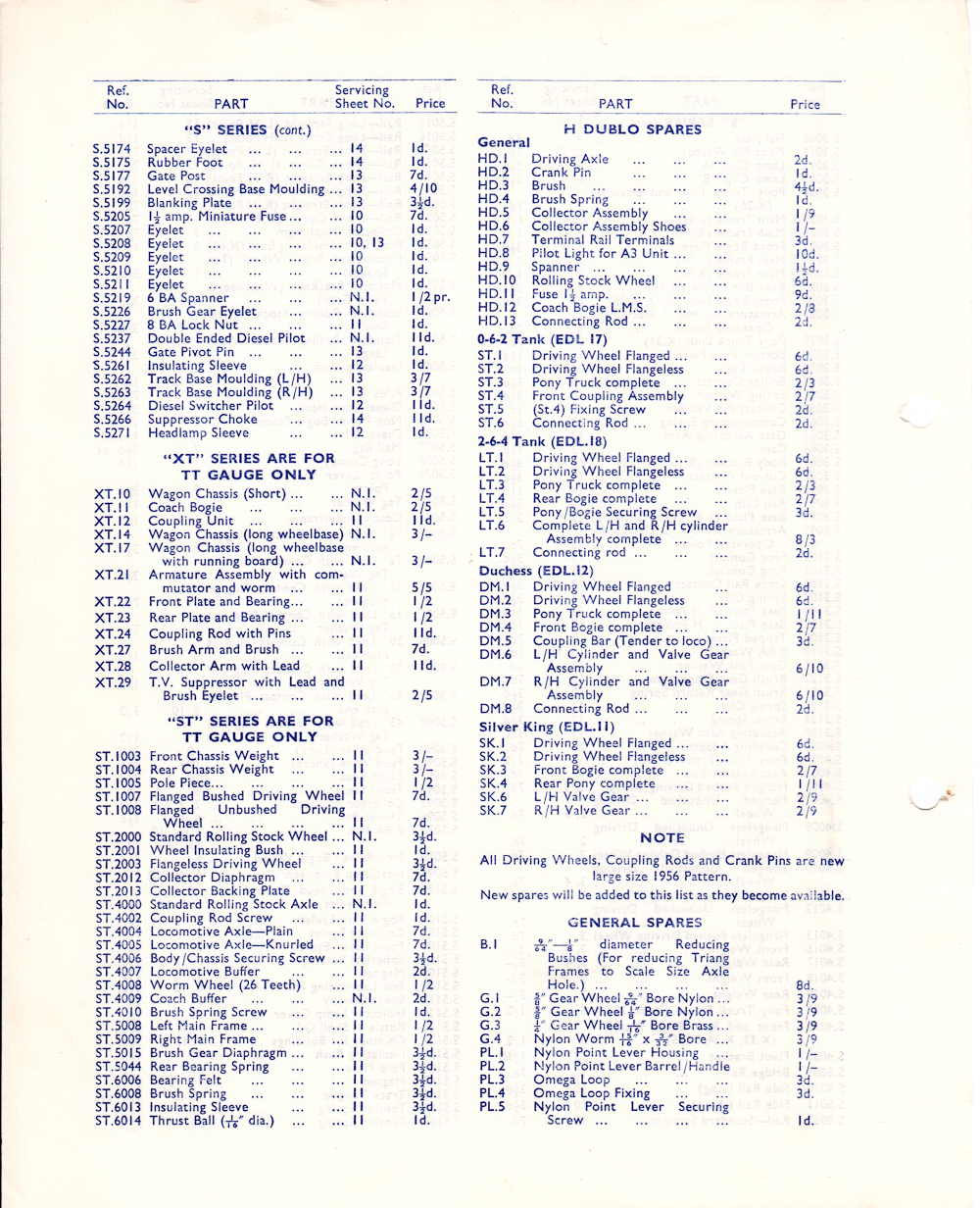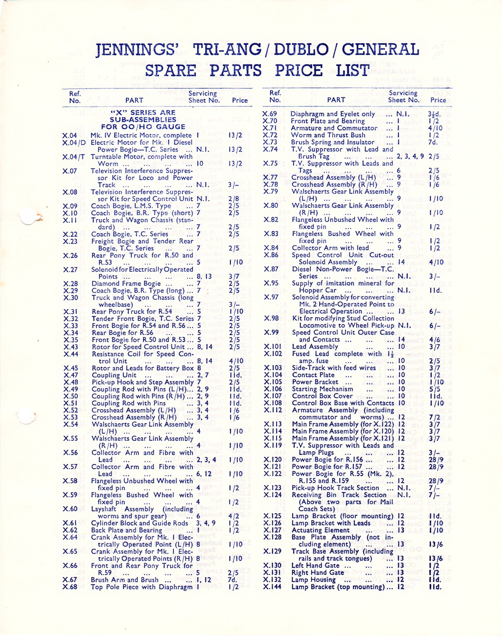the Jennings Tri-ang/Dublo General Spare Parts Price List. A Tri-ang