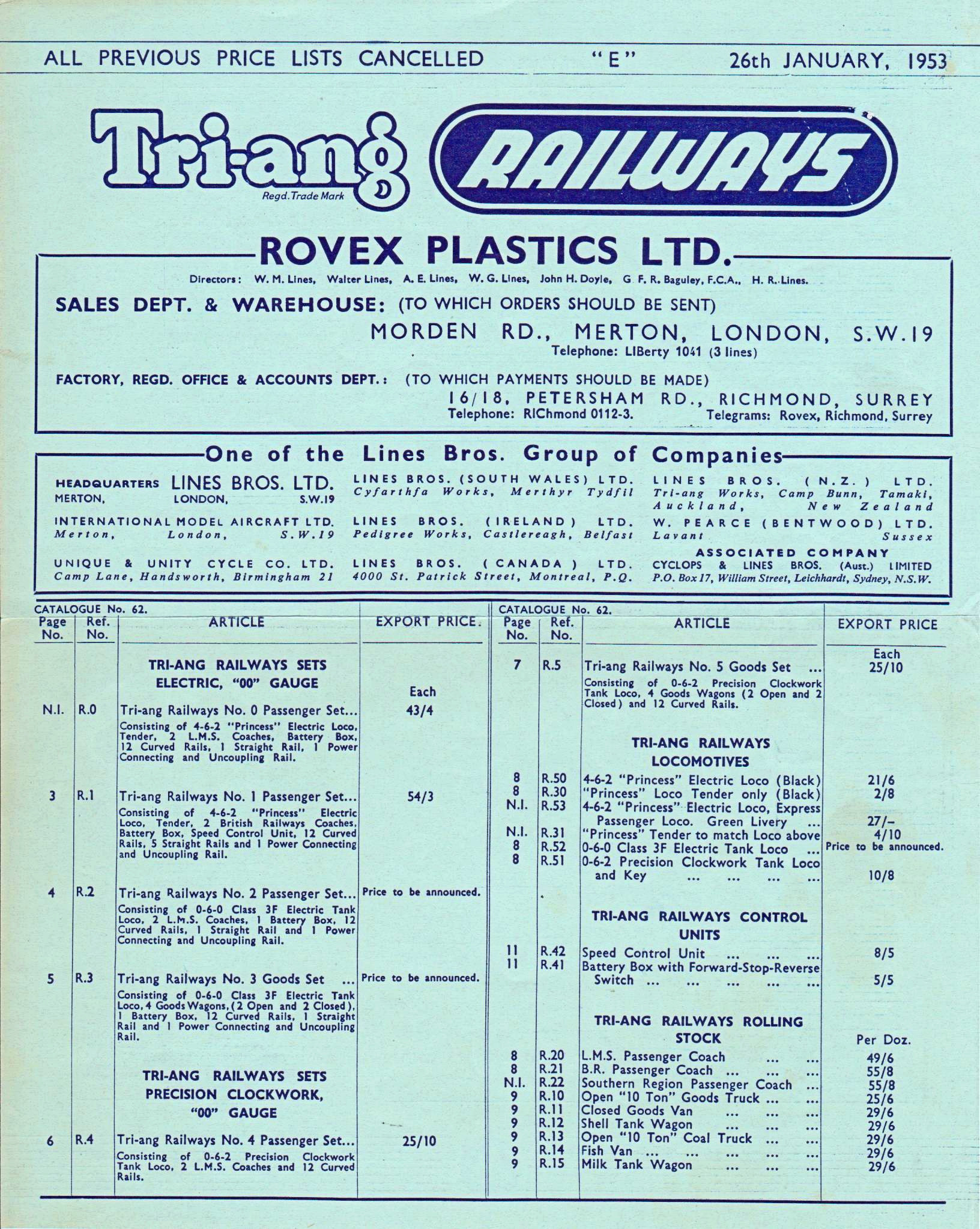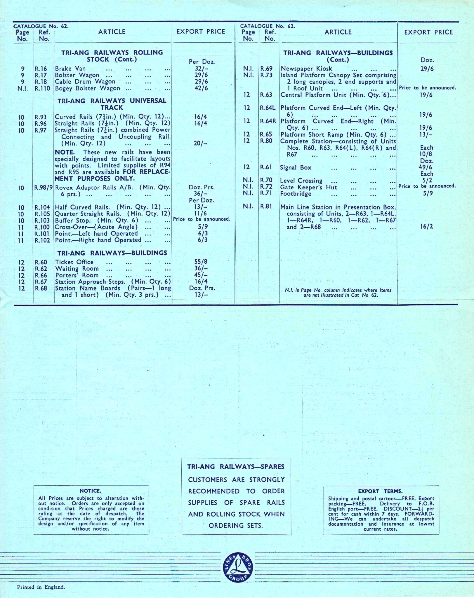 Export Price List for catalogue number 62, dating from