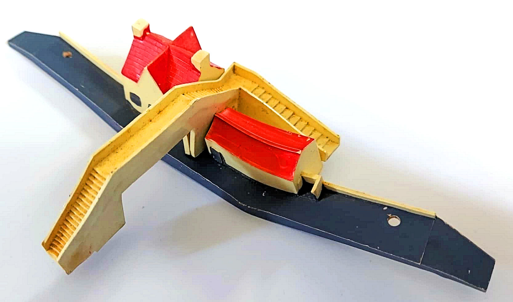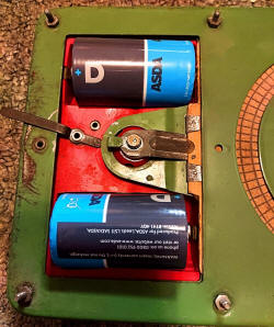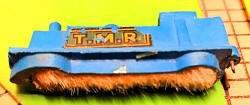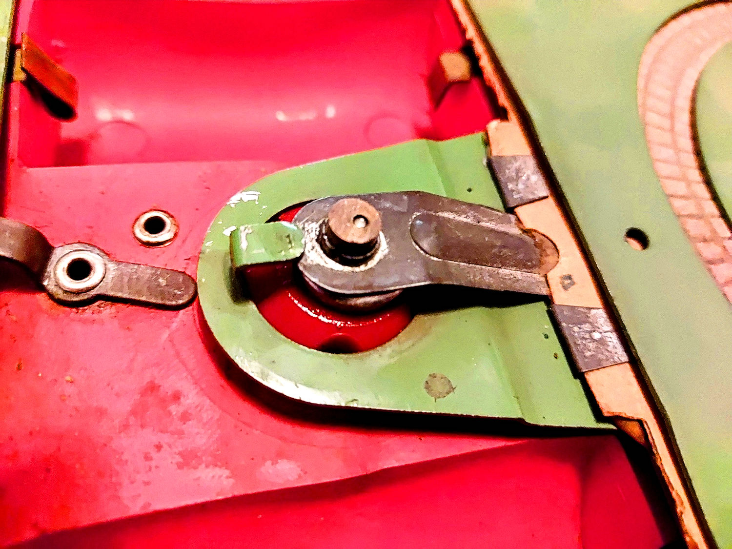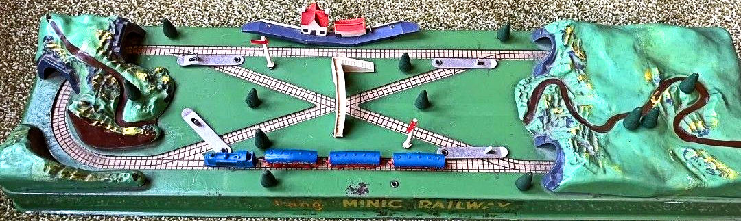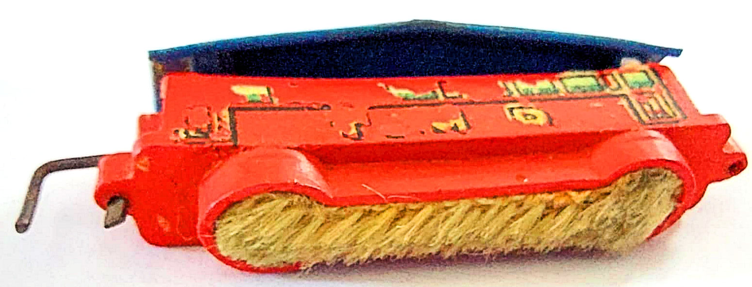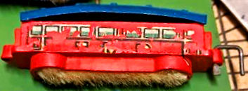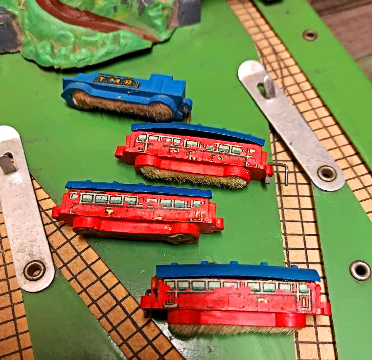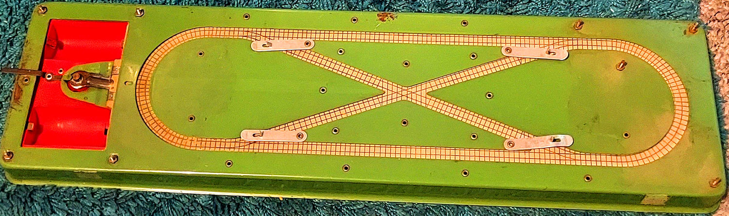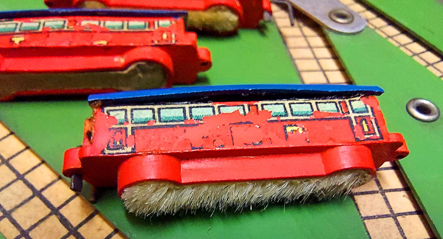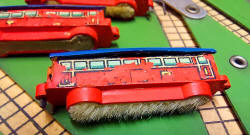 James has kinly sent me the photographs of this interesting item. It called itself an Electric Railway but in reality it had a very strange sort of motion power. The stock was not driven but the paper track in the metal frame vibrated side to side by an eccentric cam on the motor and the brushes under the stock shifted the items in one direction!! Note, the brushes all have to be facing the same way otherwise the stock fights for the direction of travel!! |