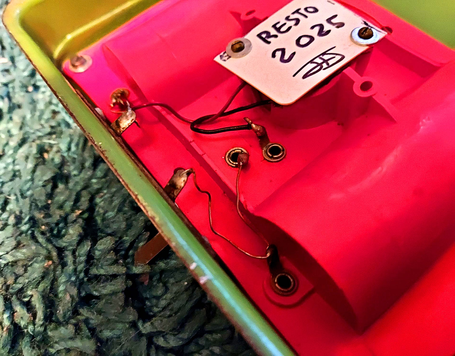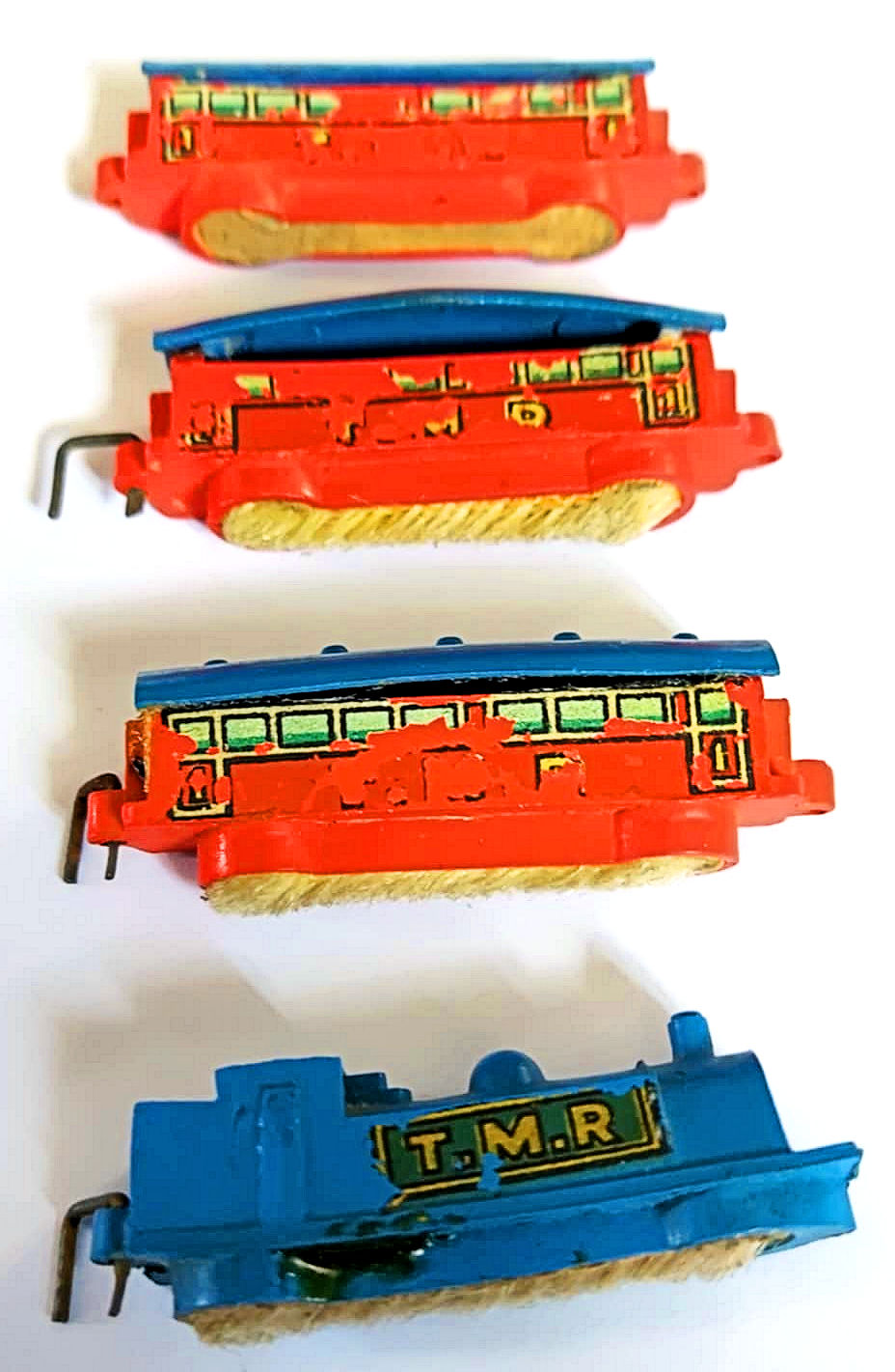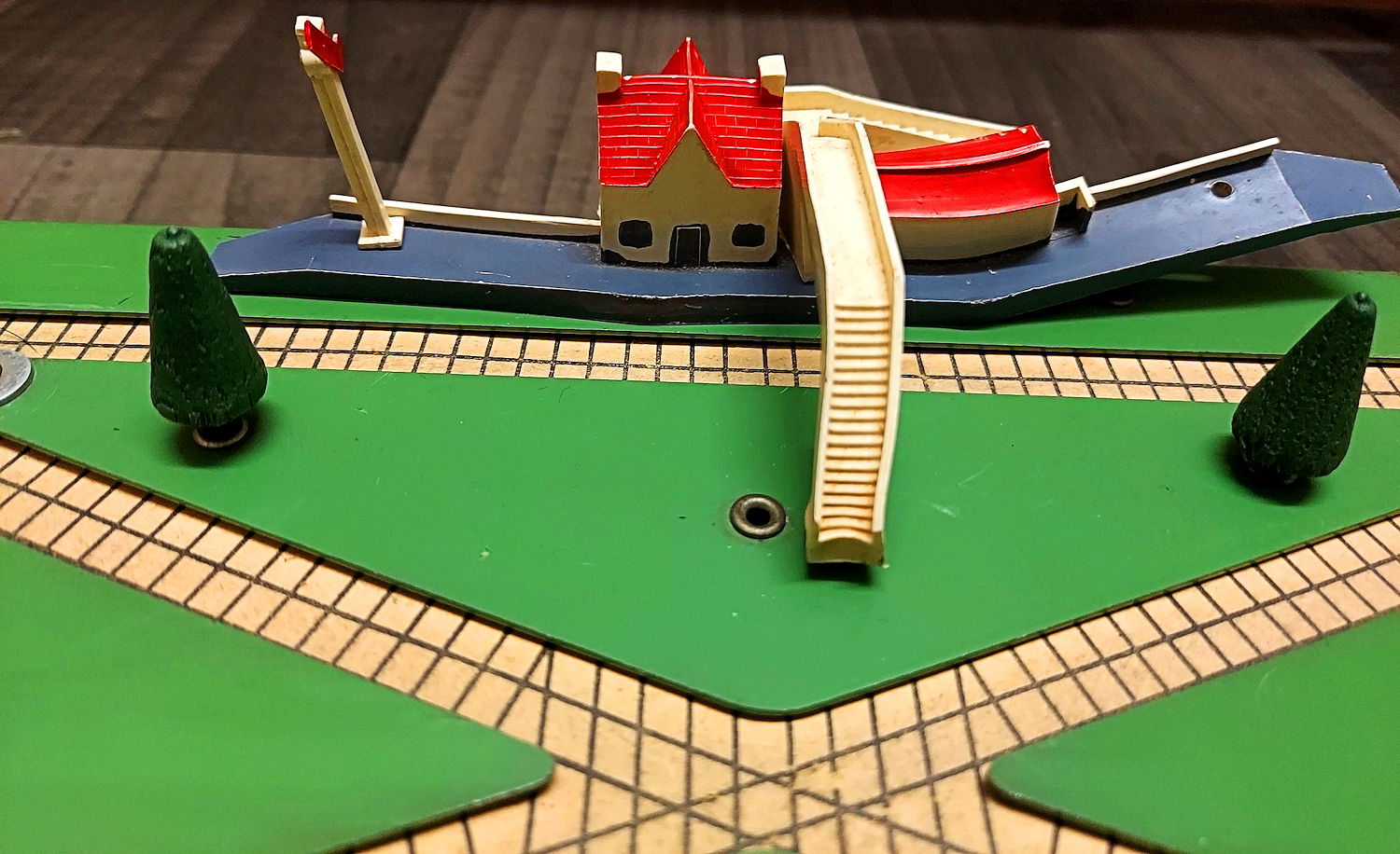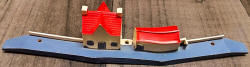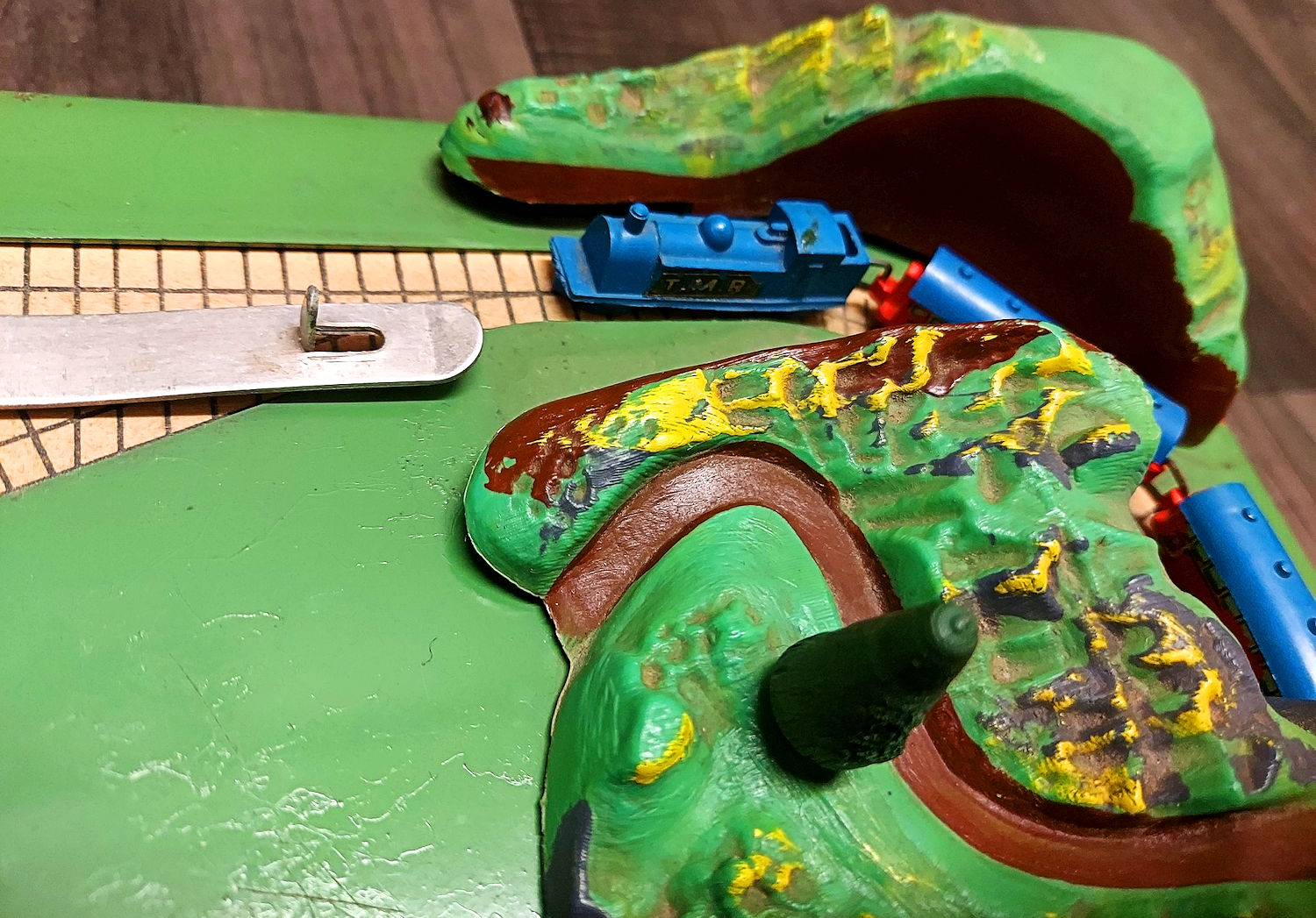 James has kinly sent me the photographs of this interesting item. It called itself an Electric Railway but in reality it had a very strange sort of motion power. The stock was not driven but the paper track in the metal frame vibrated side to side by an eccentric cam on the motor and the brushes under the stock shifted the items in one direction!! Note, the brushes all have to be facing the same way otherwise the stock fights for the direction of travel!! |