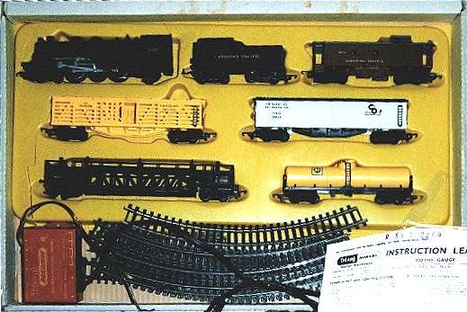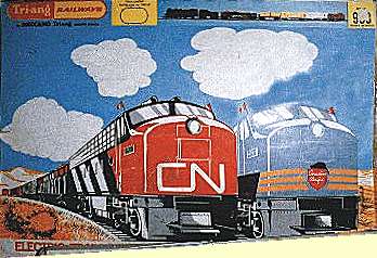 Canadian Steam Freight Set TS903. CP Pacific steam engine , C&O Refrigerator car, Shell tanker, Car transporter, CP Stock car, CN Caboose. Oval of Series 4 track and Power Controller.