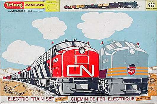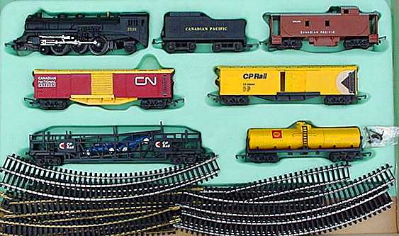 Canadian Steam Freight Set TS927 of 1971. CP Pacific steam engine, CN Box car, CP Box car, Shell tanker, CP Car transporter, CP Caboose. Oval of Series 4 track and Power Controller.