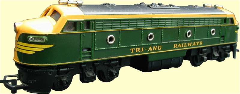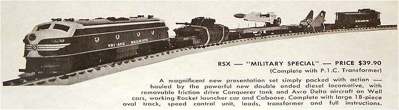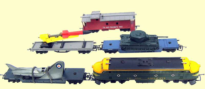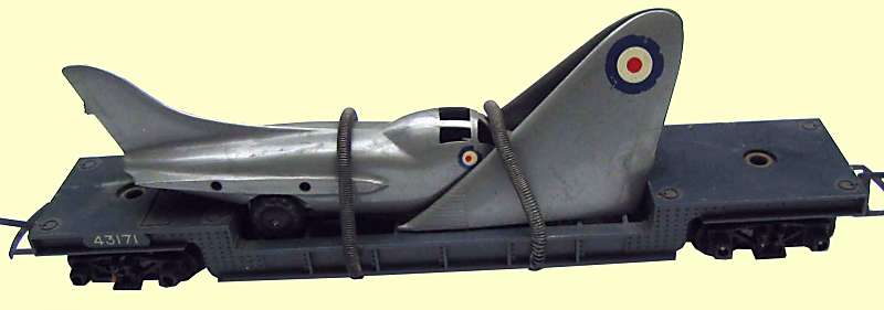 Dave Poynter's marvelous collection of the items that made up this rare 1959 R3.S Canadian Set. Including the green body double ended diesel and the Avro Delta plane mounted on the depressed center car.