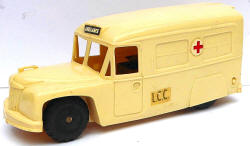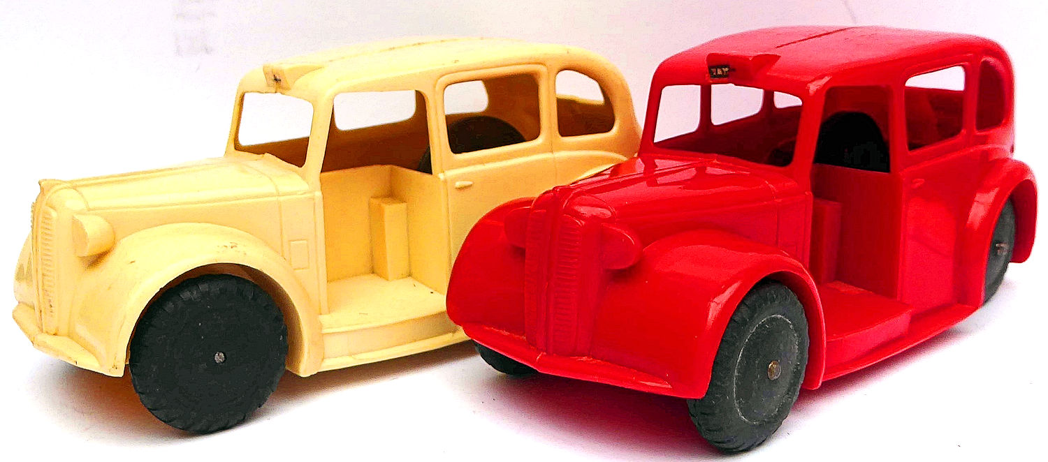 white plastic, the model is 4 inches (about 10cm) long and has “Tri-ang”