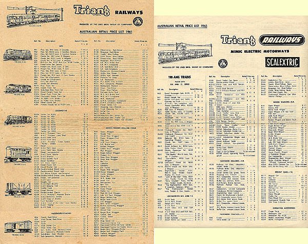 quality paper, which has yellowed and become brittle over the years. The pictures show representative ones from the period 1961 to 1971. The retail price lists showed both the Australian made range and the UK range that was available in Australia. It was usually issued in May each year when the new UK catalogue arrived in Australia. There was little indication of origin, although Australian made or packaged models sometimes had an 'A' suffix added to the catalogue number.
