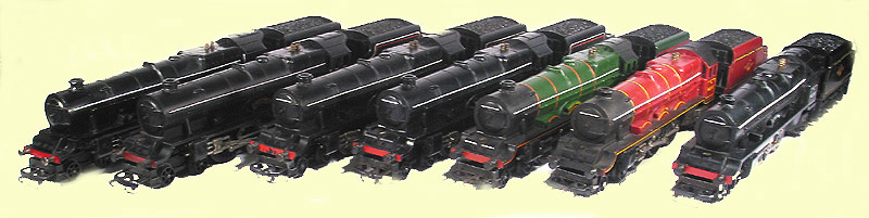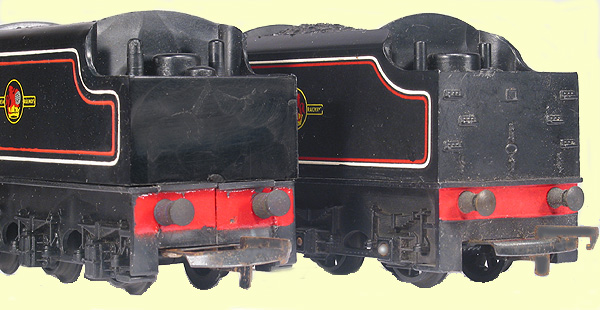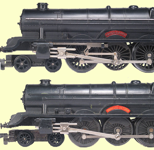 The major visible differences in the loco. body moulding between the Australian and UK versions of the Princess, can be seen in the above illustration with the Australian model on the top. The Australian model is missing the sandbox filler between the steampipe and the lubricator, there is no builders plate on the front wheel splasher, the nameplate is shorter and the topfeed cover is further forward on the boiler. The original 8 spoke bogie wheel tool was also sent to Australia/NZ and these were usually fitted, along with Australian made buffers, which were heavier than the UK made ones. Aust. made locos. also had white painted handrails, even on the black versions.