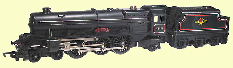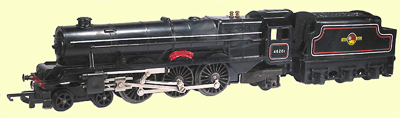 Contrary to what was suggested by the 1959 catalogue and price list this is the version actually produced by Moldex in 1959 and 1960. This is ‘Princess Elizabeth’ in black with with a built up chassis, valve gear, solid diecast wheels and heat printed lining, rather than the transfers used on UK models. The printed lining is more durable, but looks cruder than transfers. The locomotive and tender were available separately and the model was also used in the 1959 R3F set and the 1960 R3FA set.