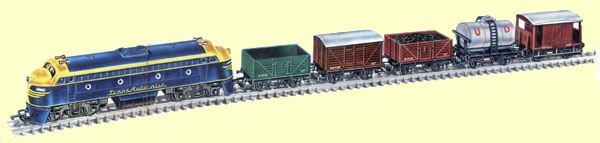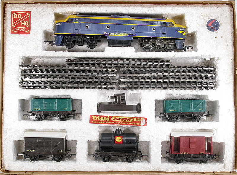 This set was a 1965 introduction to the Australian catalogue, replacing the R4Z set which had TC bogie wagons. This set survived until Moldex closed in 1970. In later years the rolling stock was imported and the set code was changed to R4FA and then RS4FA when the track was changed to System 6.