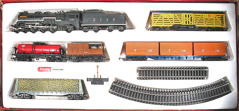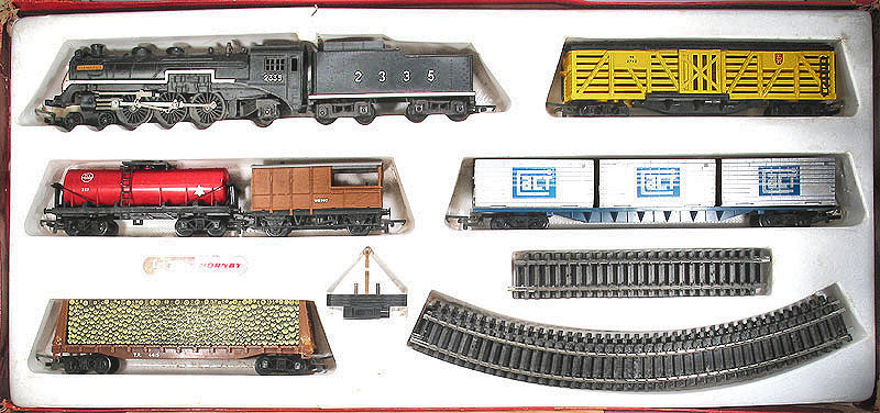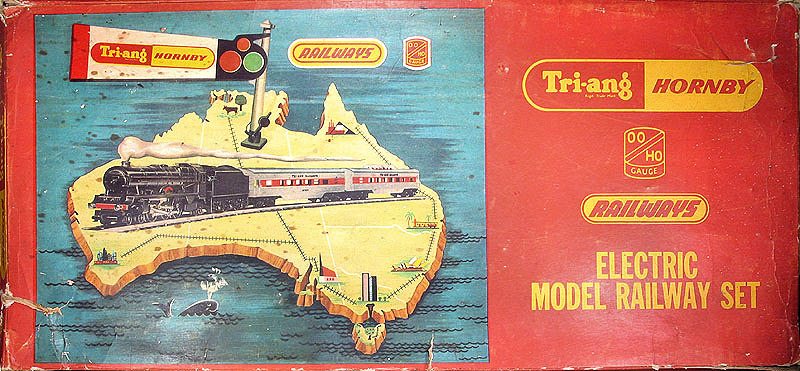 RS4CA. Made only in 1970, this set was described, but not illustrated, in the 1970/71 Australian Catalogue and contains Australian made System 6 track and imported rolling stock. Two versions of the set are known, one containing the rare brown TC pulpwood car and the rare silver ACT containers.