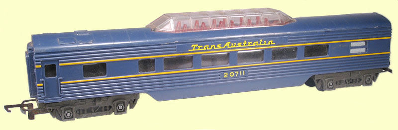 Some rare models can be found with grey roofs. The vista dome seating is in the standard red/yellow/green colours on early models, but later models had plain red seating.