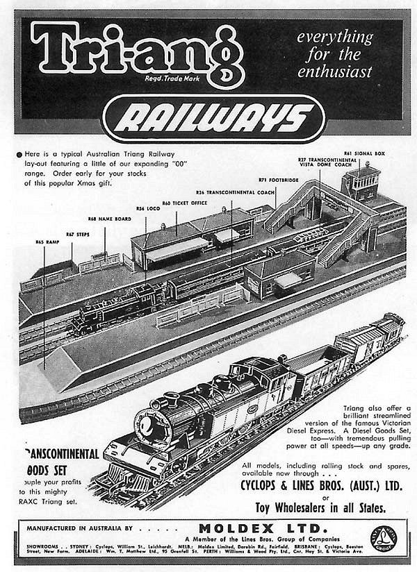 A 1958 trade advertisement for the then new range of Australian made Tri-ang Railways showing the range of buildings.