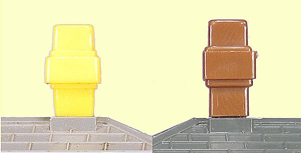 The major distinguishing feature of the buildings made by Moldex was the use of a yellow chimney moulding. As shown in the photograph, this was different to the UK made chimney and was probably moulded with the other yellow parts.