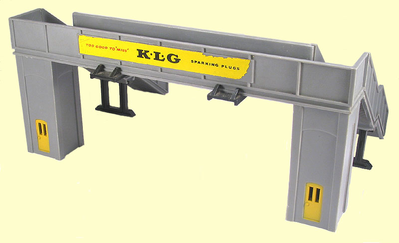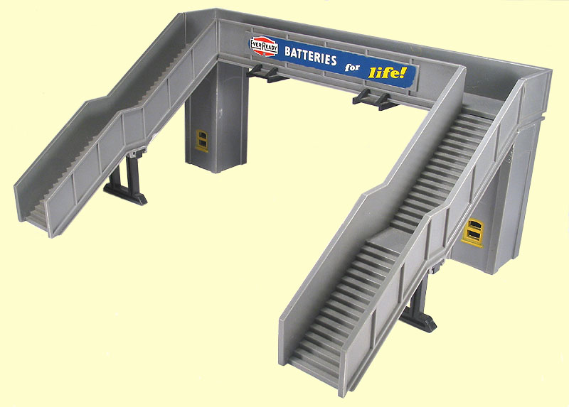 Introduced with the other station buildings in 1958, the footbridge remained available until 1967. Made from a lighter grey plastic than the UK models and fitted with transfers of UK origin.
