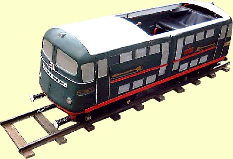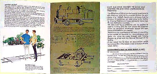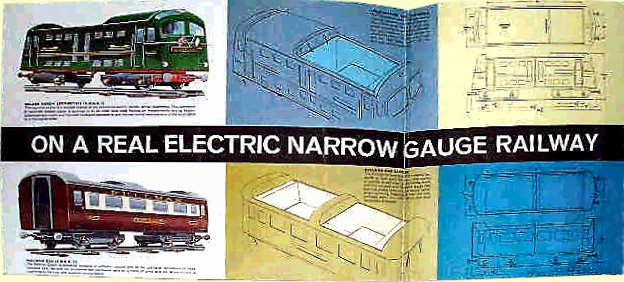 During the 1960s, Tri-ang introduced a miniature "garden" railway. The chosen scale was 10 /1/4" (26cm) it ran from current picked up from the rails at 36v. There was an engine, Pullman coaches and a ride on 'toastrack' wagon. Many of them went to holiday camps.