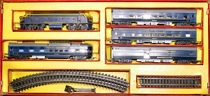 This is an unusual version of the RS34 set, containing a Moldex TransAustralia R159 loco and Moldex Super 4 track, with UK made Transcontinental coaches in a Rovex box.