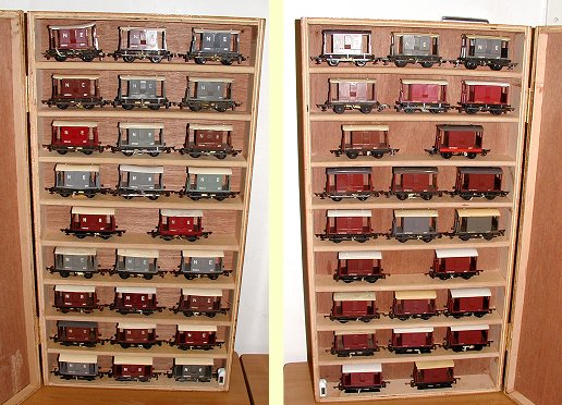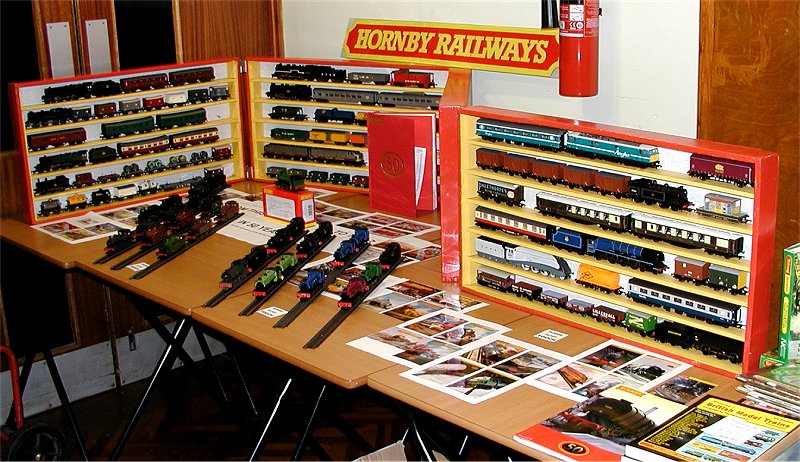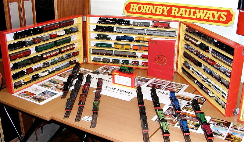 Pat Hammond with a display featuring 50 years of Tri-ang and Hornby