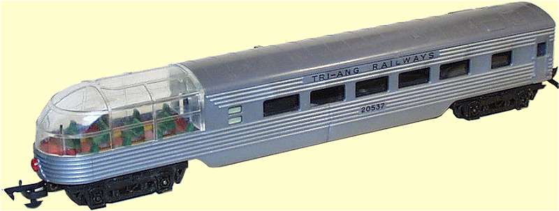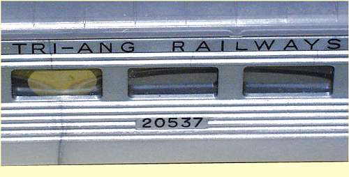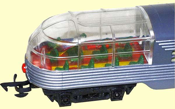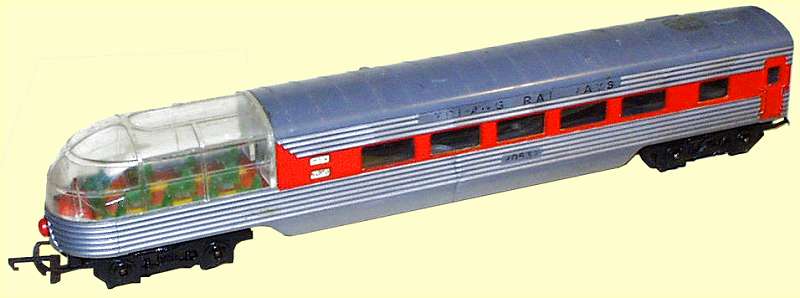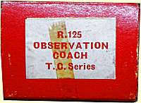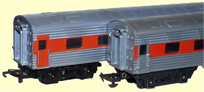 Two versions of the Observation Car. The one on the left has the later bogies and the Red Stripe covering the door. The coach on the right has the earlier bogie and a Silver door.