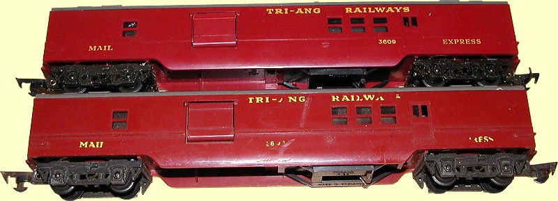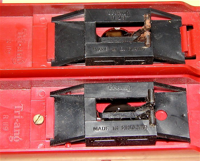 The actuating mechanism on the very early coach, top in the above photo, was taken from the R.23 Mail Coach already in production, on later models, lower photo, it was changed to a bespoke unit. Also the early coaches had their roof glued on, whilst on the later version it was fixed with a screw.