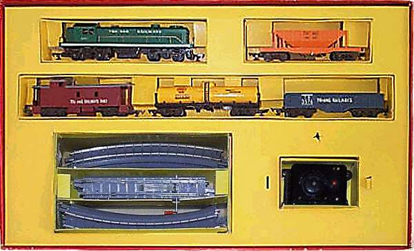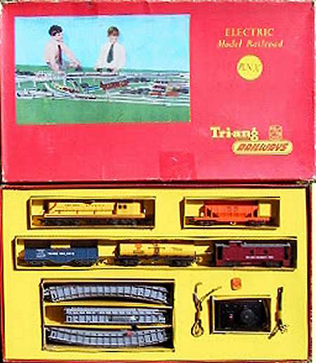The RNX Set was introduced in 1957 and contained TC Bo-Bo Switcher, four freight cars, R111, R115, R116 and R117. 12 curves, 6 straights and a R42 controller.