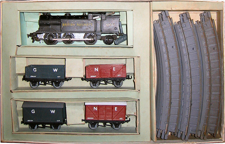 Clockwork 0-6-2 tank, two Vans, two Open Wagons, 12 curves.