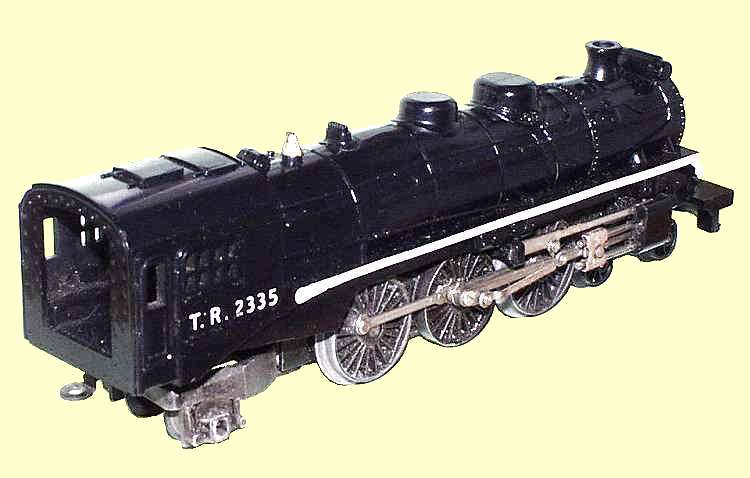 Original version made from shiny Acetate plastic and using the Princess chassis. The front bogie had no coupling and the body carried a "cow catcher". There was an imitation light in the center of the smokebox door.