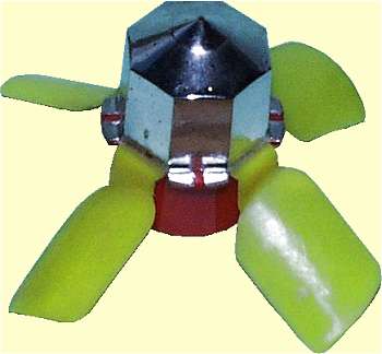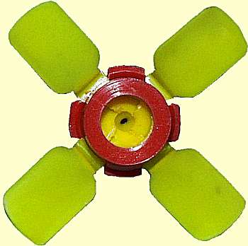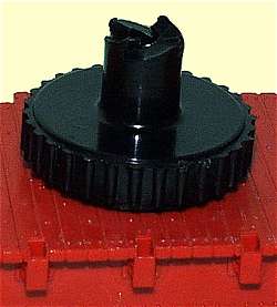 Spring was wound up using the knurled knob. Claws on the knob engaged in the Satellite spline. When the trip lever hit the trackside switch, the spring was released and the blades spun actually providing the lift for the Satellite to fly.