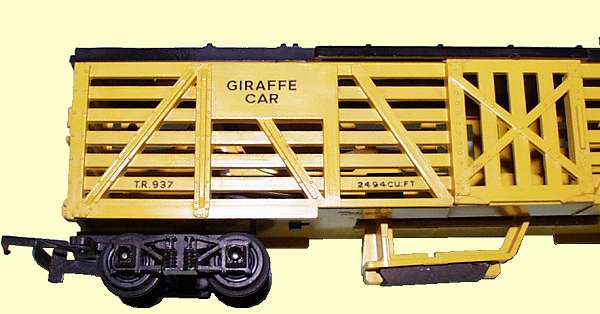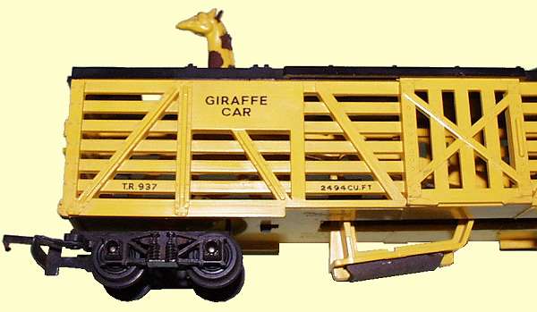 A magnet suspended below the car was pulled down as it passed over a steel rail mounted in the track, this moved a lever and the arm, inside the wagon with the giraffe mounted on it, rocked, moving the giraffe down to duck under the trackside telltale flag. A return spring moved it back up when the magnet was released.
