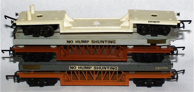 2. Two later versions, different brown bases and grey tops. No "Made in England" on base. Paper stickers for "No Hump Shunting" and for wagon number B909204.