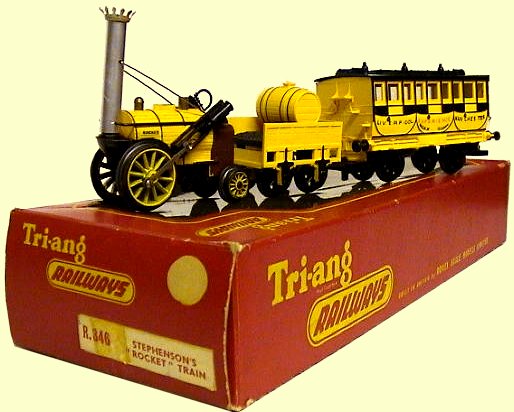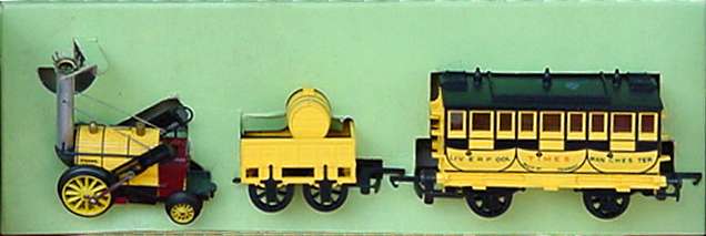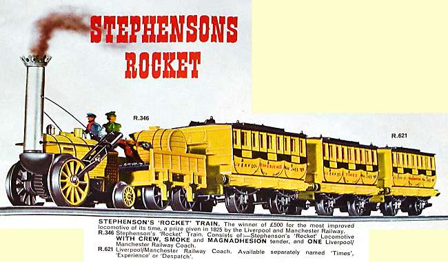 The R346 Set was introduced in 1963 and contained a Rocket Loco and Tender R651, Liverpool and Manchester Coach R621 and two figures.