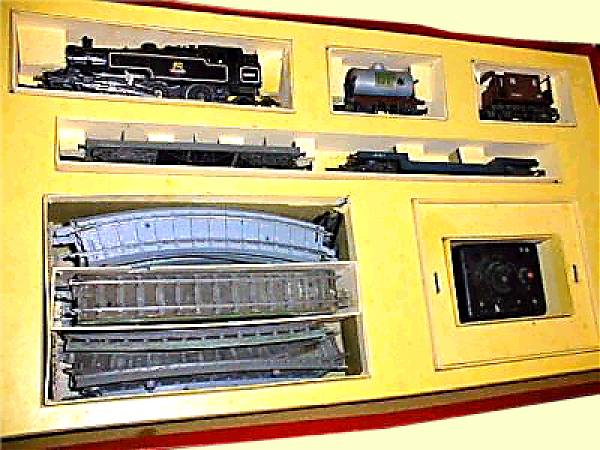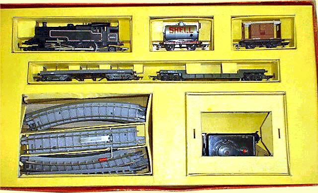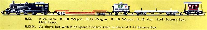 The RDX Set was introduced in 1957 and contained a 2-6-2 BR tank, four wagons, R12, R16, R110 and R118. Standard track 12 curves, 2 straights and a R42 controller.