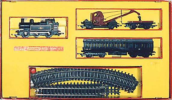 Introduced in 1963, contained, Jinty, R127 crane, R17 match truck, and R620 Black clerestory coach. Eight double curves and two straights.