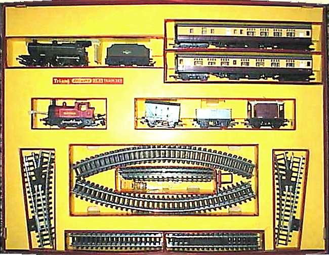 L1 Loco, two BR coaches, R626, R627. Polly/Connie loco three wagons, R243, R11, R16. 10 double curves, 12 straights, 3 points and a buffer stop.