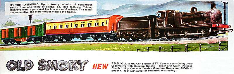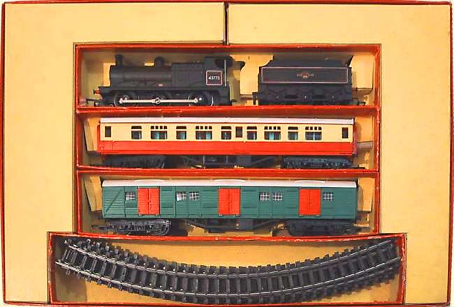 Introduced in 1965, contained, Deeley 3F, Red/Yellow 9" coach and a Red/Green utility van. Eight double curves and two straights.