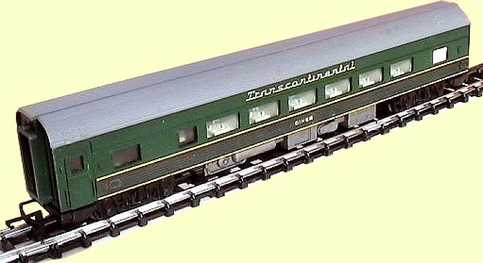 T.C. 2nd Series R.338 Diner but moulded in dark green plastic. The bottom section is spayed dark green as per standard Duo tone green finish but the lining is applied on the bottom and middle lines as per a blue livery vehicle. It was purchased from Australia but the rivets are standard brass finish suggesting assembly in the UK. A standard duo tone green coach is shown for reference.